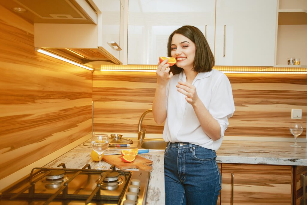 young and pretty brunette standing in the kitchen with orange